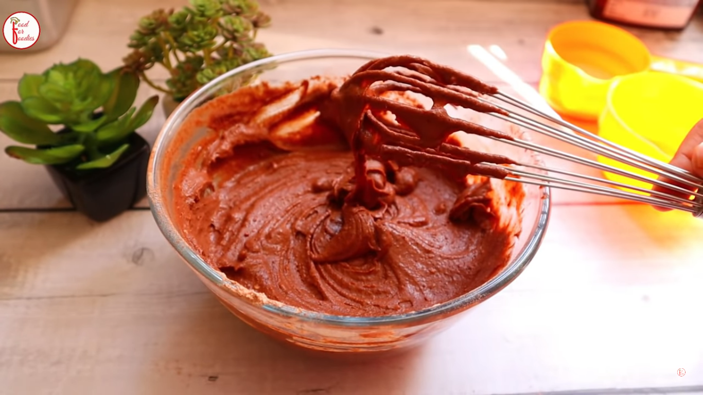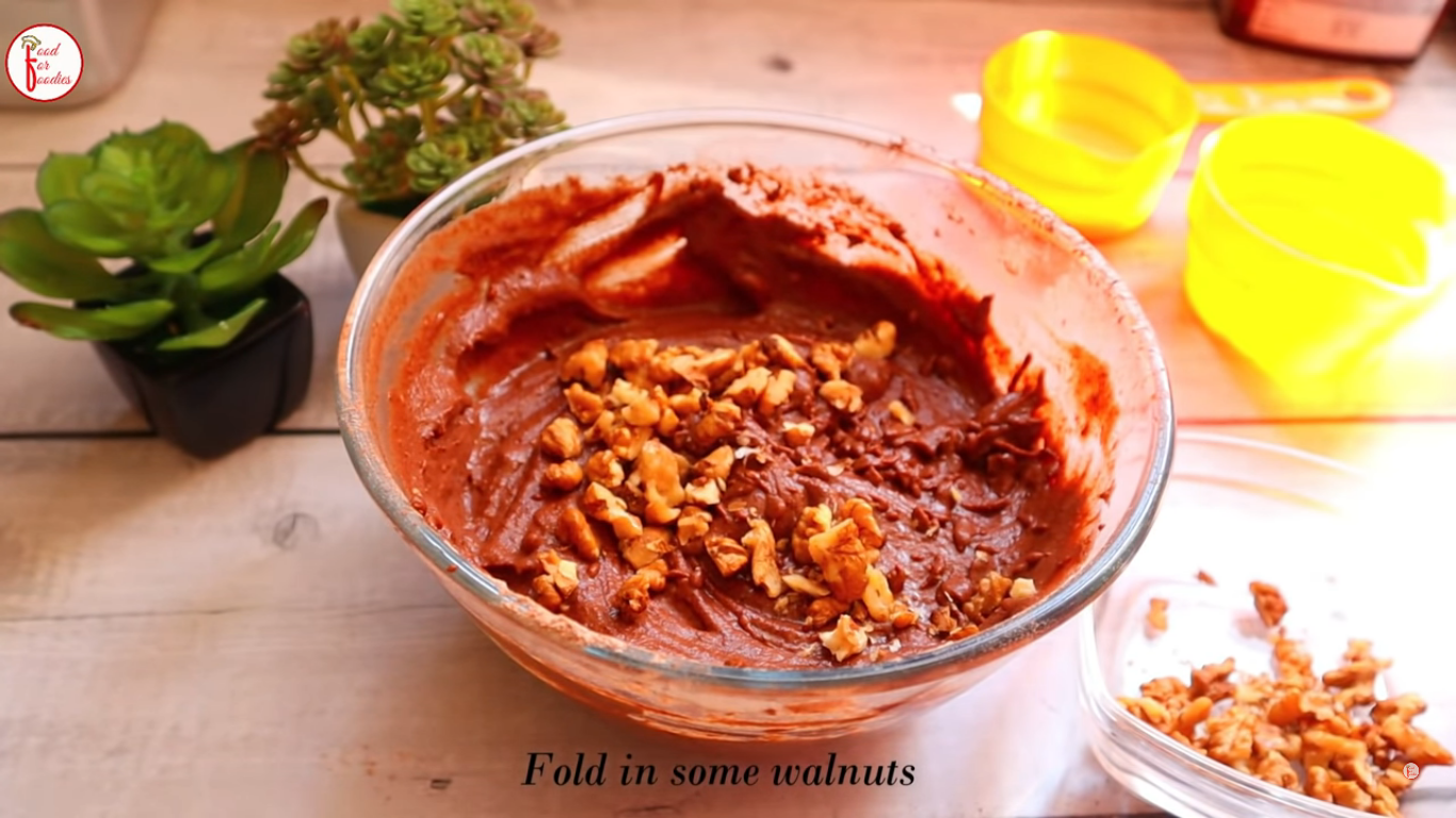 • In the same bowl, sieve ¾ cup of all purpose flour, 2-3 tbsp of cocoa powder, and baking powder. Give it a good mix and gradually add milk to maintain the thickness. Add some chopped walnuts or any other dry fruits.
