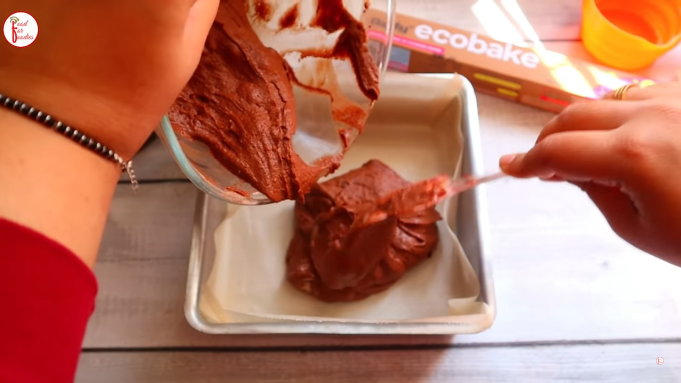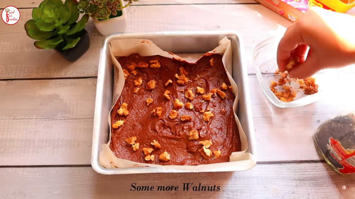 • Take a baking tin and line it using Brown Oddy Ecobake baking and cooking paper, and pour in the batter. Spread the batter evenly using spatula and top it with some more walnuts and choco chips.