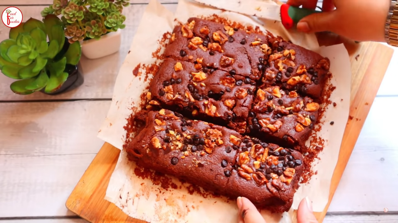 • Bake it for 30 mins in the microwave. After 30 mins, take out the baked brownie from the microwave, and cut it into pieces