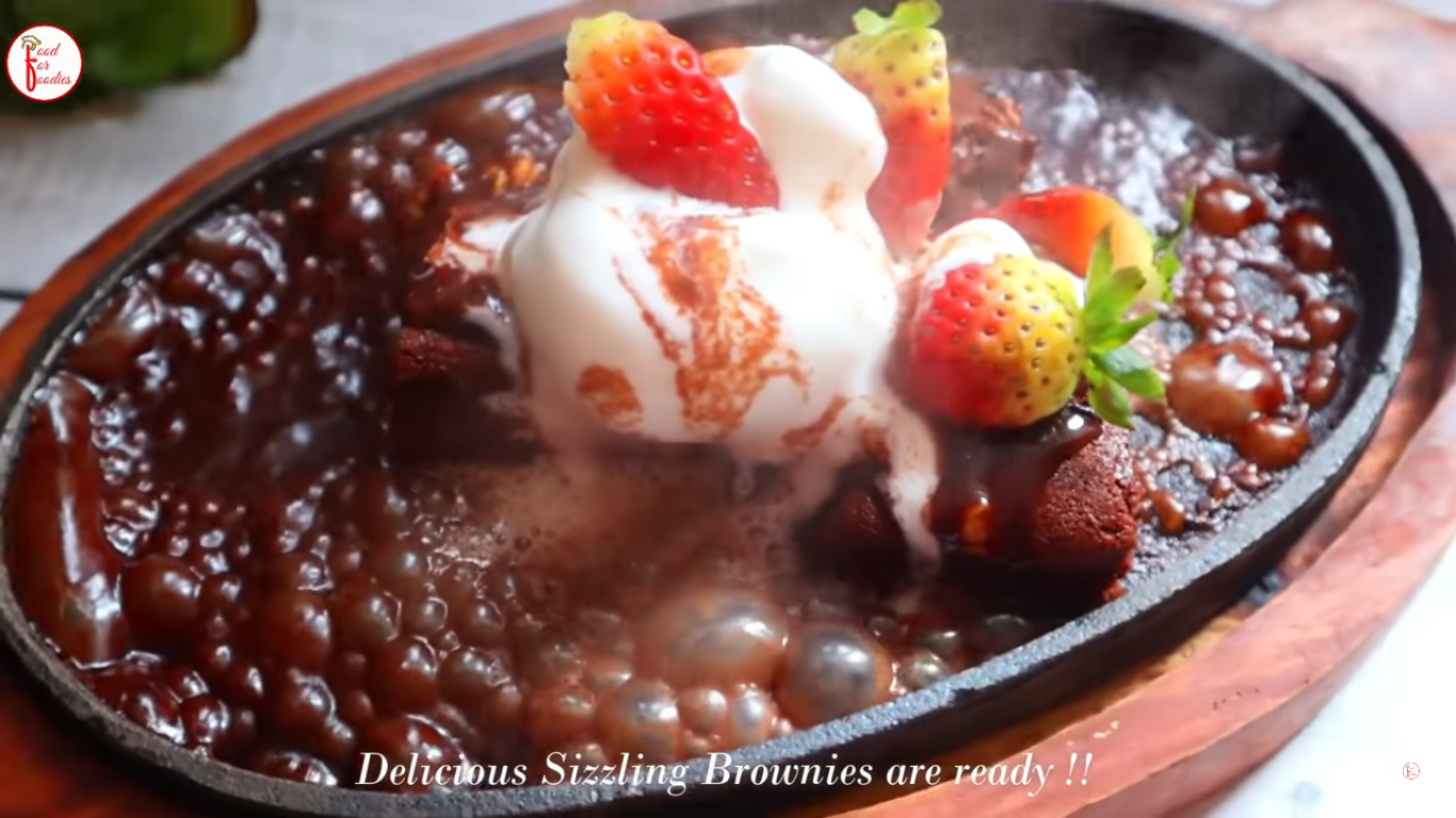 • Now take a sizzler plate, heat it and serve chocolate brownie as shown in the video.