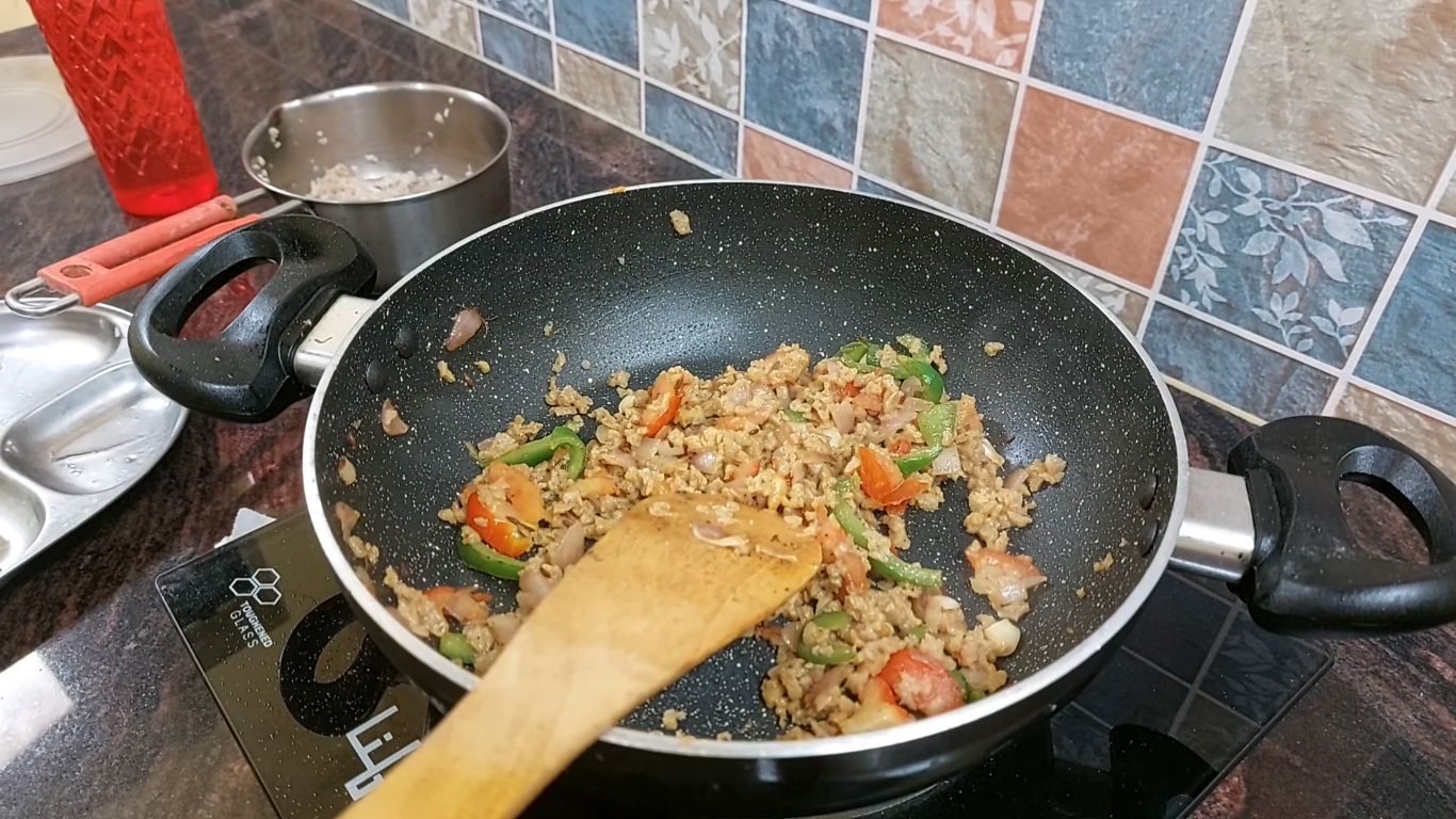 • Then add chopped capsicum and tomato to the pan. Now, add soaked soya granules to the pan, mix it and add salt, red chili powder, coriander powder, and a few pinches of garam masala with some turmeric powder.