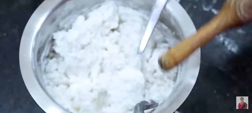 - In a bowl add 1 cup water and add 1 pinch of salt, little sugar, and 1 tbsp ghee. Let the water boil nicely and remove it from the flame. Sieve the rice flour and add while the water is still hot, cover with a lid, and keep aside.