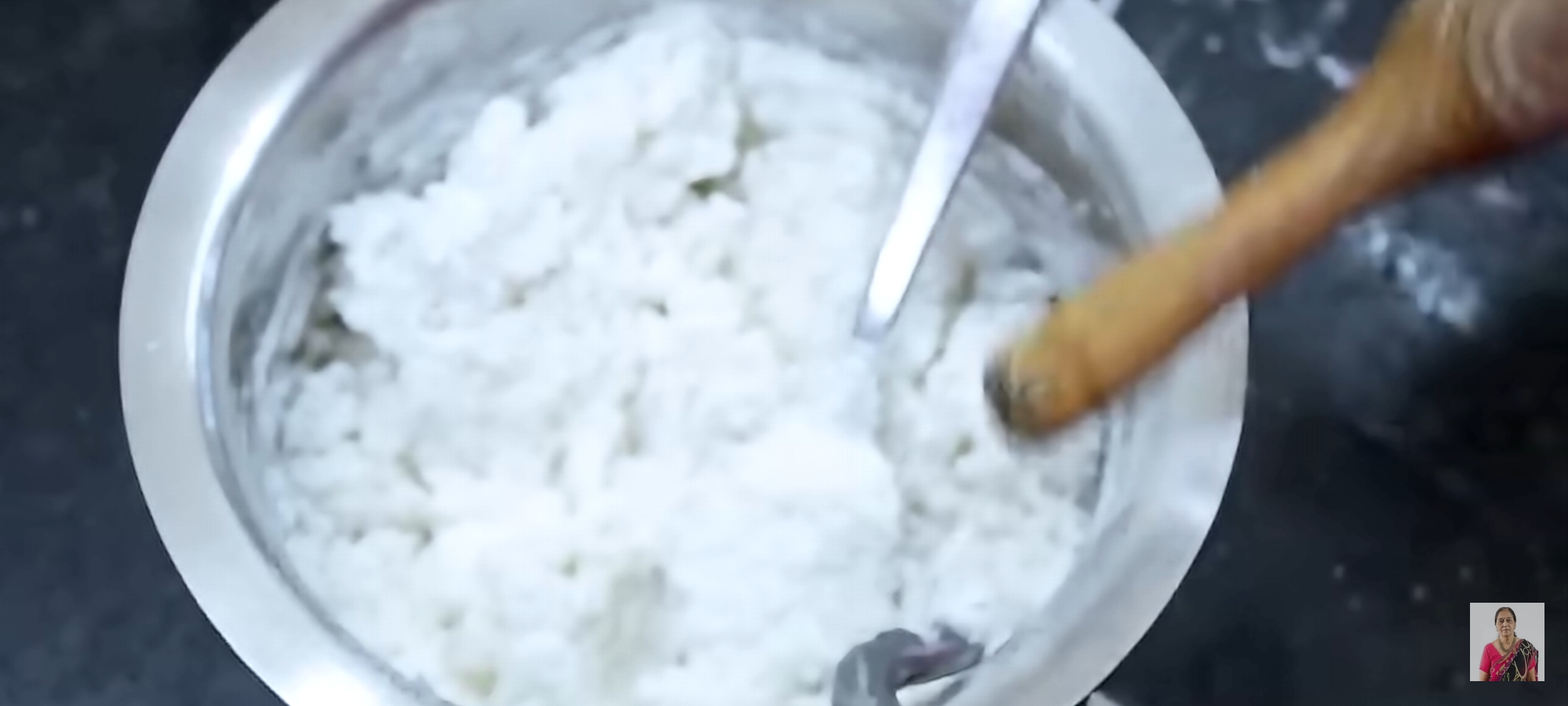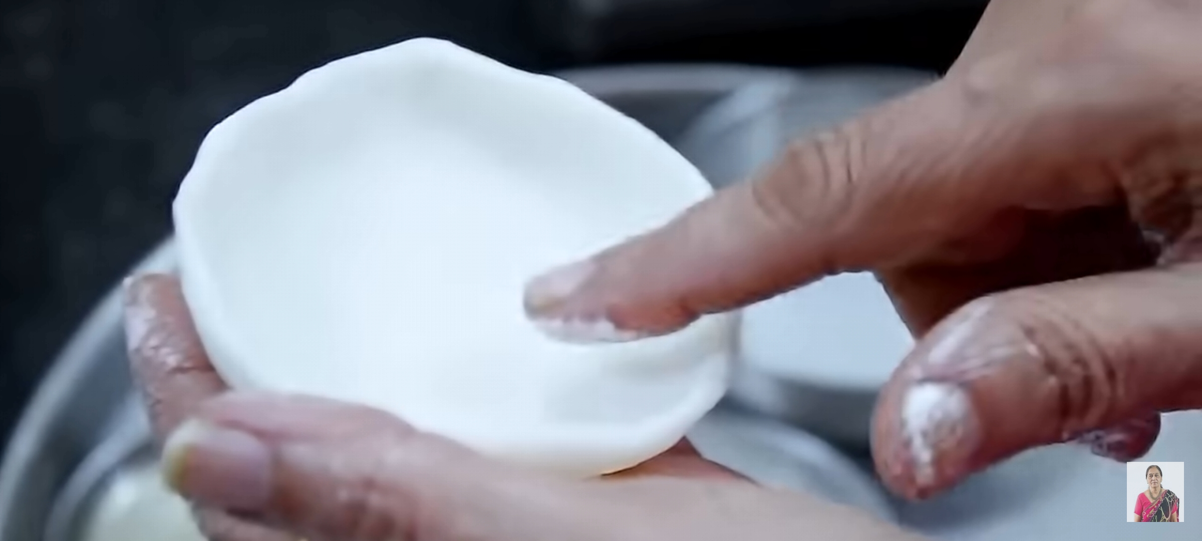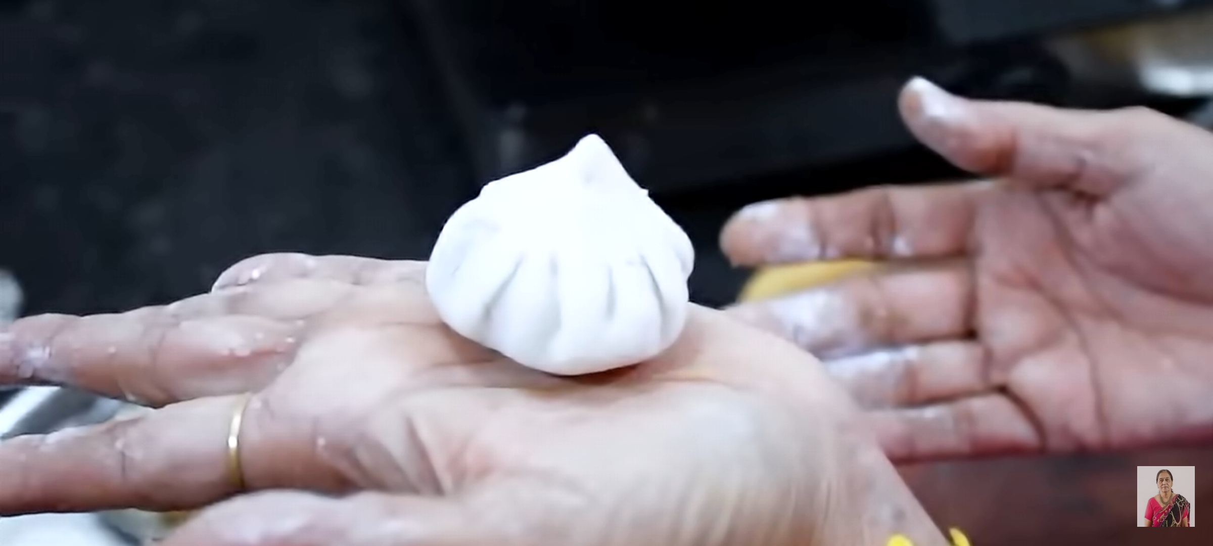 - Take the rice flour mixture and make it into a dough, add water or milk to bind the dough. Take the dough and make a small ball. Now flatten it as shown in video and use the rice flour or ghee to make the shape of modak.