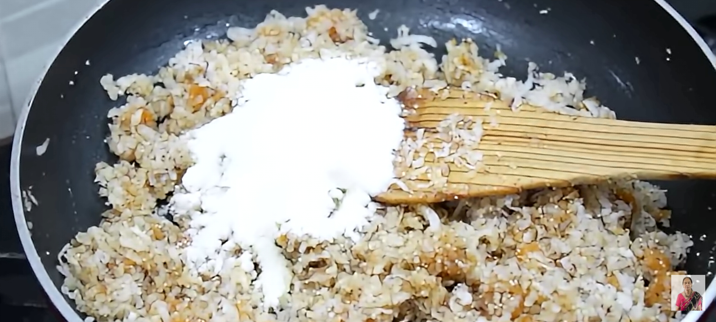 - In a pan add 1 tbsp ghee, and poppy seeds, and roast it. Add grated coconut, jaggery, milk, and cardamom powder. Add a pinch of nutmeg powder, and milk powder and mix well. Our modak mixture is ready.
