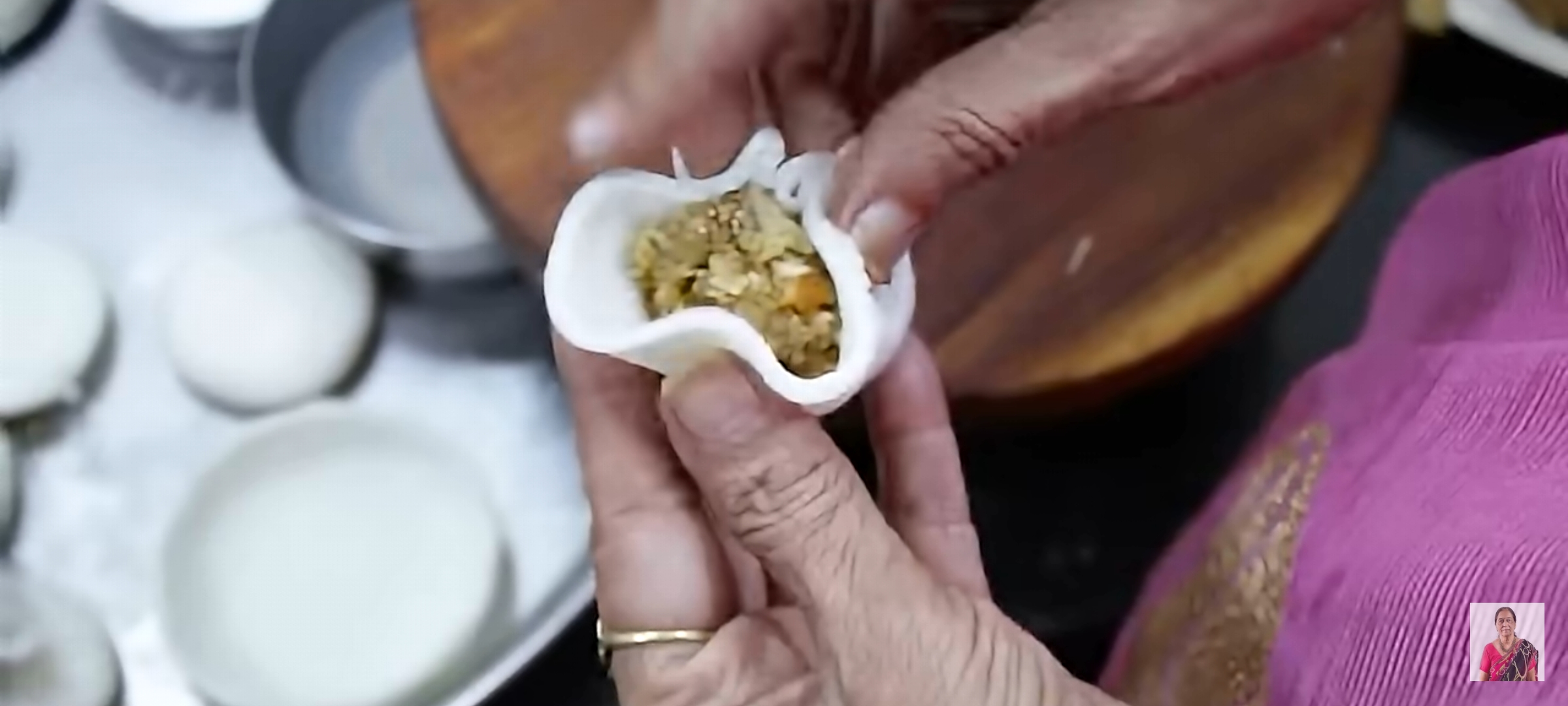 - Fill it with the modak mixture and fold it to cover the edges. It should form the shape of modak. Repeat the same process with the rest of the dough.