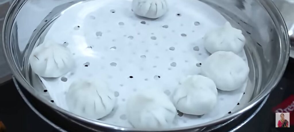 - Let it cook for 10-12 mins and check whether it is cooked. Remove the modak and now our Steamed modak is ready to serve.