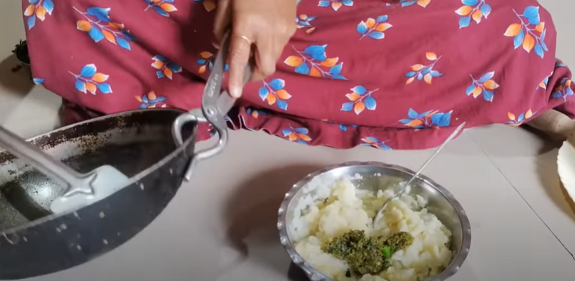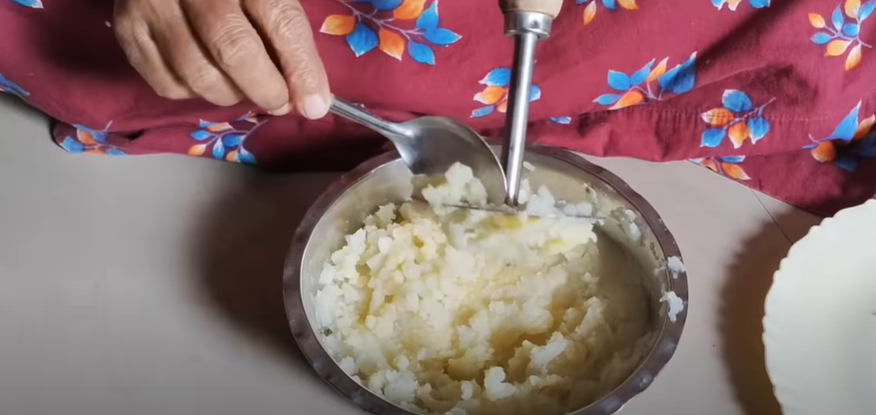 • Take a mixing bowl and put the boiled potatoes in it. Mash them well. Take a mixer jar and add chopped ginger, garlic cloves, and green chillies to it and grind them together. 'Thecha' will be ready.