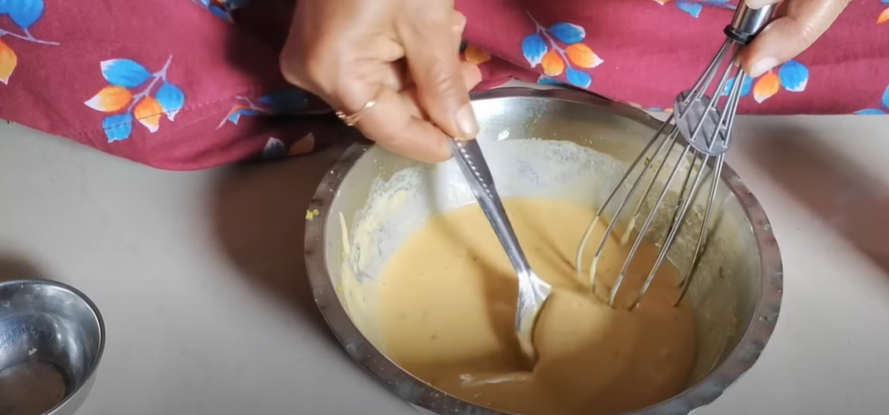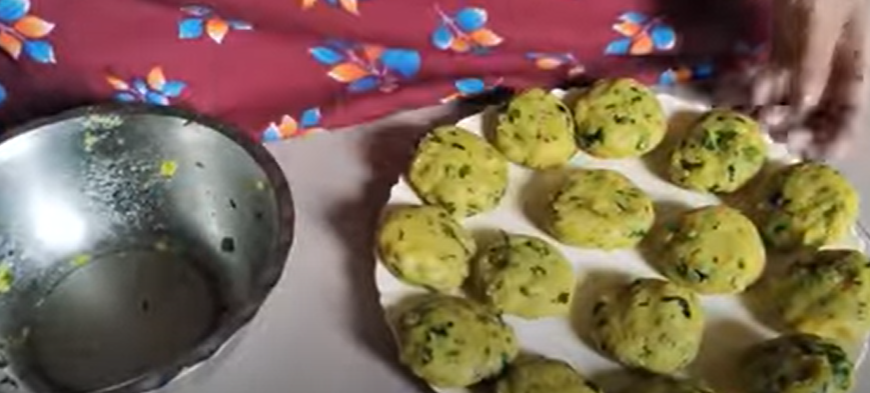 • For making batter, mix gram flour, asafoetida, turmeric powder, ajwain (by rubbing well on hands), and salt well together. Add a little water at a time to make a pourable batter. Finally, add baking soda to it and mix well to the batter.