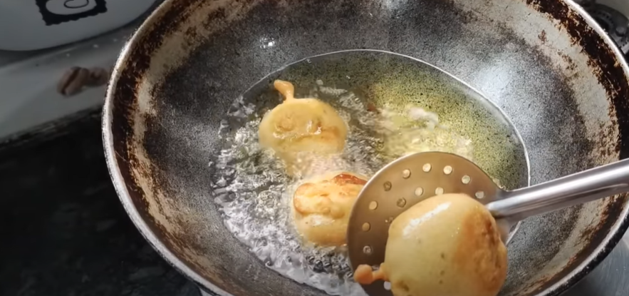 • Heat some oil in a pan on medium heat to fry 'Potato Vada'. Take a little ball of potato stuffing and dip it deep into the batter. And add to the pan. You can add 3–4 Vadas at a time to the pan, depending on their size.