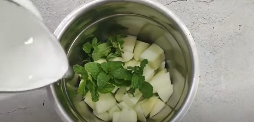 • Peel and cut a raw mango into small pieces. Grind them together with water and mint leaves. Strain the puree to separate the mango mint water in a bowl.