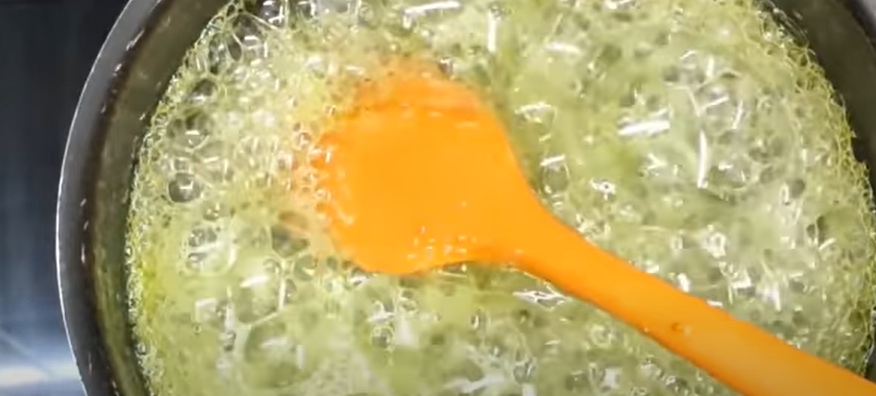 • Melt sugar in a pan with 3 tablespoons of water. Once the sugar melts, add the upper mango water to the sugar syrup and mix well. Cook until a softball consistency is attained.