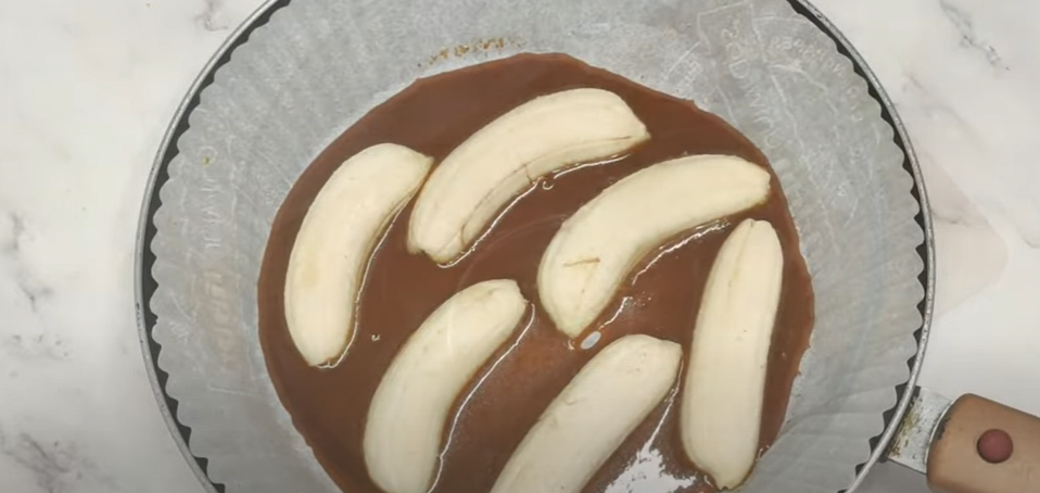 • Cut four bananas into two halves and place them on the caramalized mixture on the Ecobake cooking tray. Prepare cake batter by mixing the dry ingredients and wet ingredients seperately and combining them.