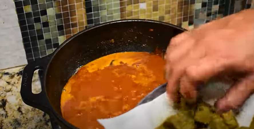 - Chop onions. Grind the tomato, a piece of ginger, garlic cloves, and 1 green chili to a fine paste in a blender. Mix turmeric powder, Kashmiri chili powder, cumin powder, and coriander powder into a masala paste. Heat mustard oil or any oil and let the red chilies splutter. Add cumin and let it crackle.