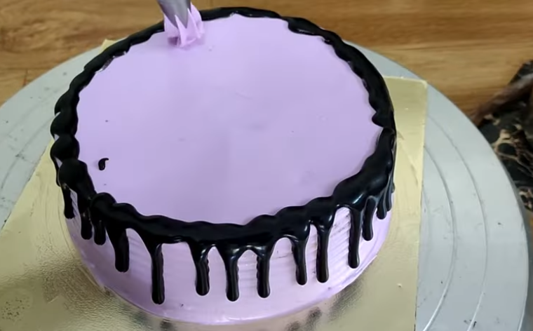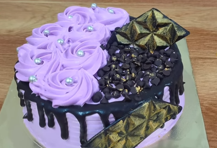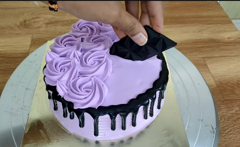 • Frost the cake with this cream and smooth using a spatula. Create rosettes using purple cream by using the 1N nozzle.