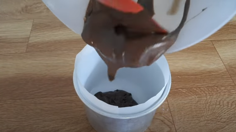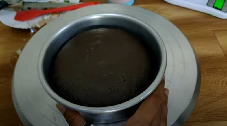 • Mix the chocolate cake premix with water and make a smooth batter. Line a 6-inch baking pan with Oddy Ecobake. Transfer the batter to it, spread it out, and tap it well.