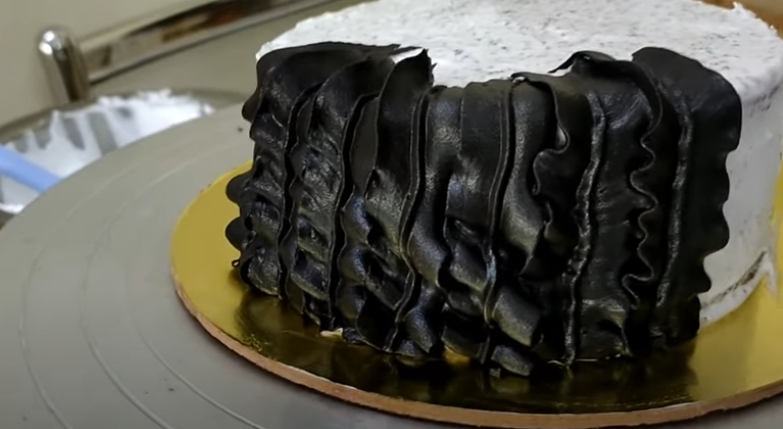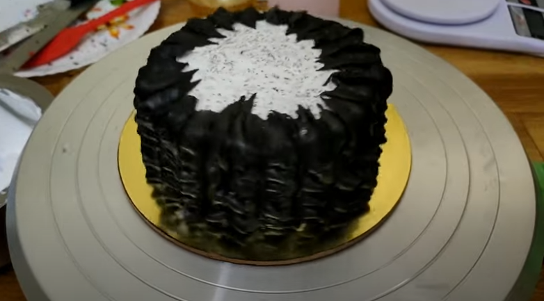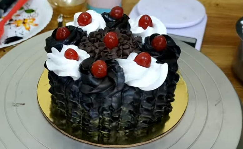 • Alternately, create rosettes on the top of the cake using whipping cream and chocolate cream filled in a piping bag using a 1N nozzle.