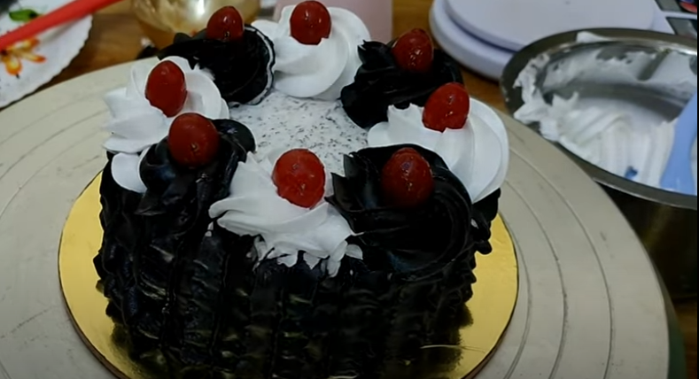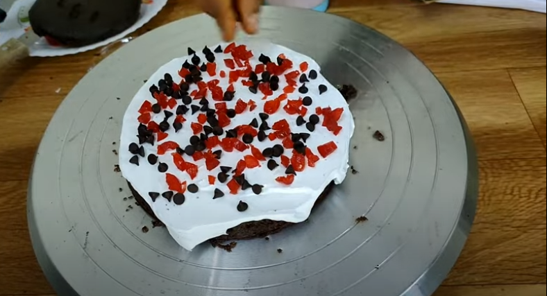 • Cool completely and unmould. Cut the cake into two layers. Place a layer on the cake board, soak with sugar syrup, and spread the whipping cream. Top with a few chopped cherry pieces and chocolate chips. Cover with a top layer.