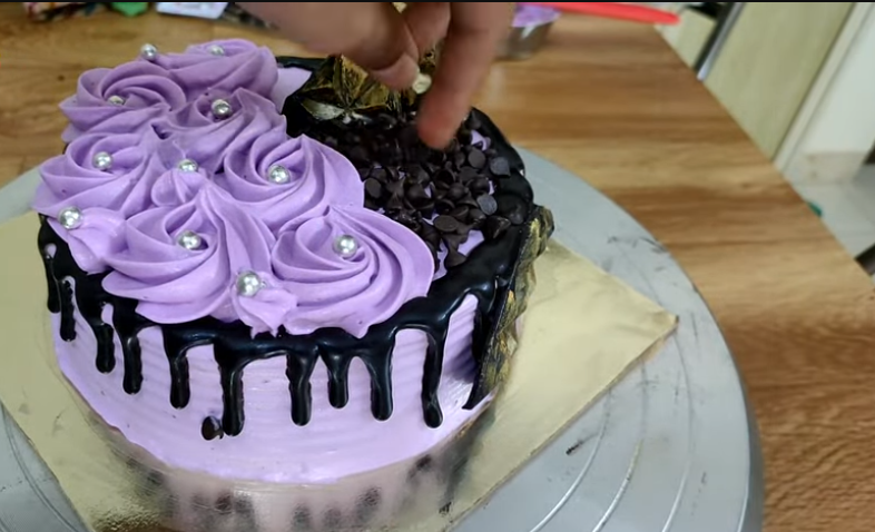 • Drip chocolate ganache filled in a piping bag on the sides of the cake as shown. Garnish with chocolate bars, choco chips and silver sugar balls on the top and sides. Dust the chocolate bars with golden dust. The attractive cake decoration is done.